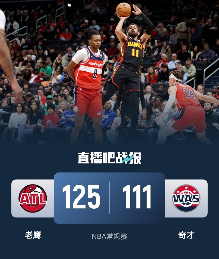 此役一上来,老鹰反客为主率先发力,内外结合的他们一度占优,但奇才多点开花迅速回应,首节结束时奇才领先4分,次节回来,奇才延续火力保持优势,特雷-杨突然发力单节独得17分,率队末段发力一举反超,半场战罢,老鹰反超5分。易边再战后奇才进攻稍显滞涩,尼昂手感滚烫连中三分,老鹰连续轰出得分高潮,三节结束后老鹰已经领先21分,末节上来,普尔找到感觉率队追分,但老鹰总能给予回应,奇才追分未果,最终老鹰125-111力克对手。