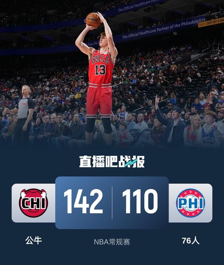 此役一上来两队迅速找到节奏,许尔特手感滚烫连中三分,乔治联手马克西及时回应,双方你来我往火热对攻,但末段76人进攻出现停滞,首节结束时公牛确立9分优势,次节回来,基迪无人可挡单节狂揽15分,公牛延续火力扩大优势,半场战罢,公牛已经领先17分。易边再战后76人进攻彻底断电,公牛多点开花牢牢占优,三节结束后公牛将分差拉开到39分,末节上来,中段双方分差一度来到50分,比赛提前失去悬念,最终公牛142-110大胜终结6连败,同时送给76人8连败。