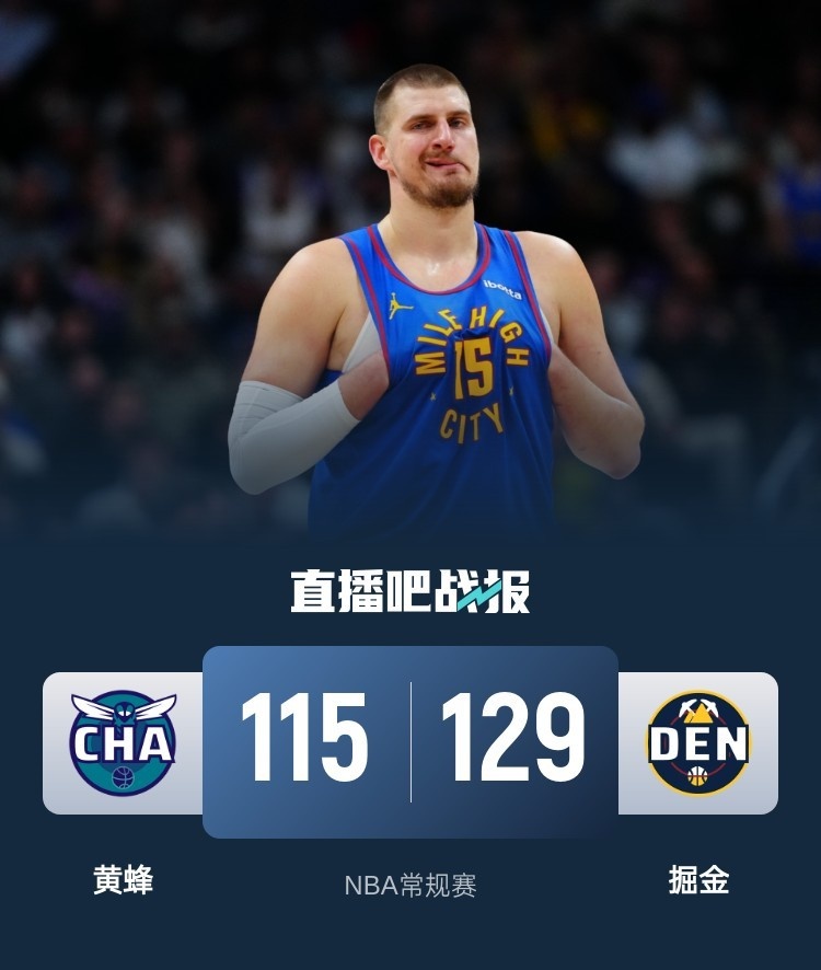 比赛开始,双方开场大打对攻,约基奇单节14分带队占据主动,次节双方围绕10分分差展开拉锯战,掘金稳扎稳打保持优势,赛斯-库里连续拿分追赶,半场战罢掘金66-58领先黄蜂。易边再战,黄蜂展开反击,内外开花不断蚕食分差并扳平比分,末节掘金攻防两端发力重获两位数优势,黄蜂苦苦追赶无果,最终,掘金129-115击败黄蜂。