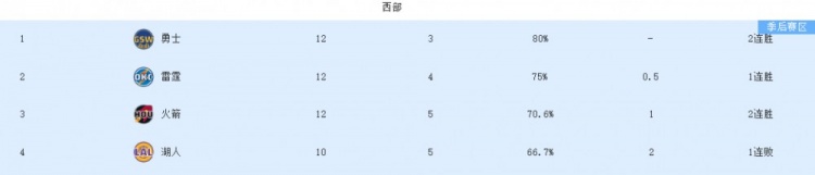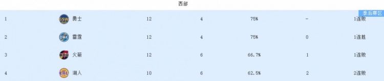 输球之后三支球队的排位没有变化,勇士排第1、火箭第3、湖人第4。