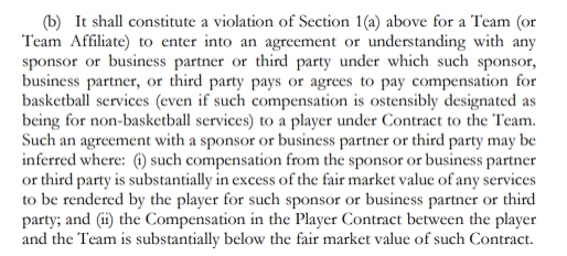 如果球队与任何赞助商、商业伙伴或第三方达成协议,而该赞助商、商业伙伴或第三方根据该协议向球队签约的球员支付或同意支付篮球服务报酬(即使该报酬表面上指定为非篮球服务),则构成对上述规定*的违反。