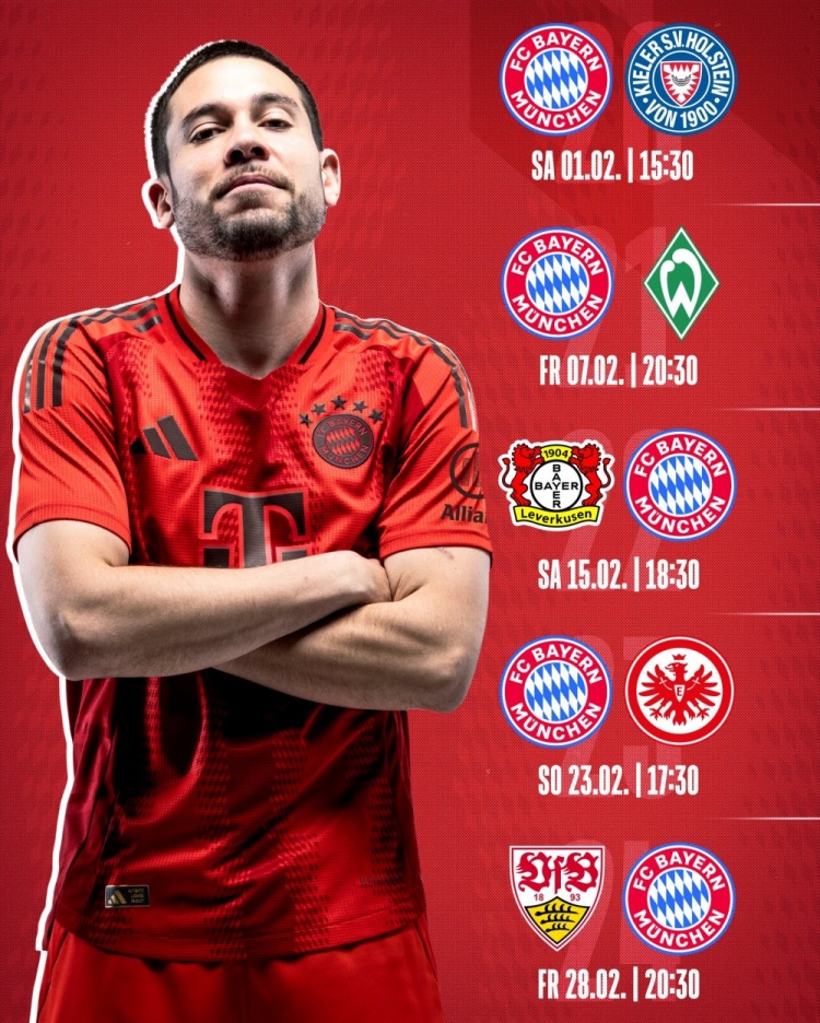 12月19日讯 德甲第20轮到第24轮比赛时间出炉,拜仁晒出了球队的赛程,2月16日1点30分客场对阵勒沃库森,2月24日0点30分主场对阵法兰克福。