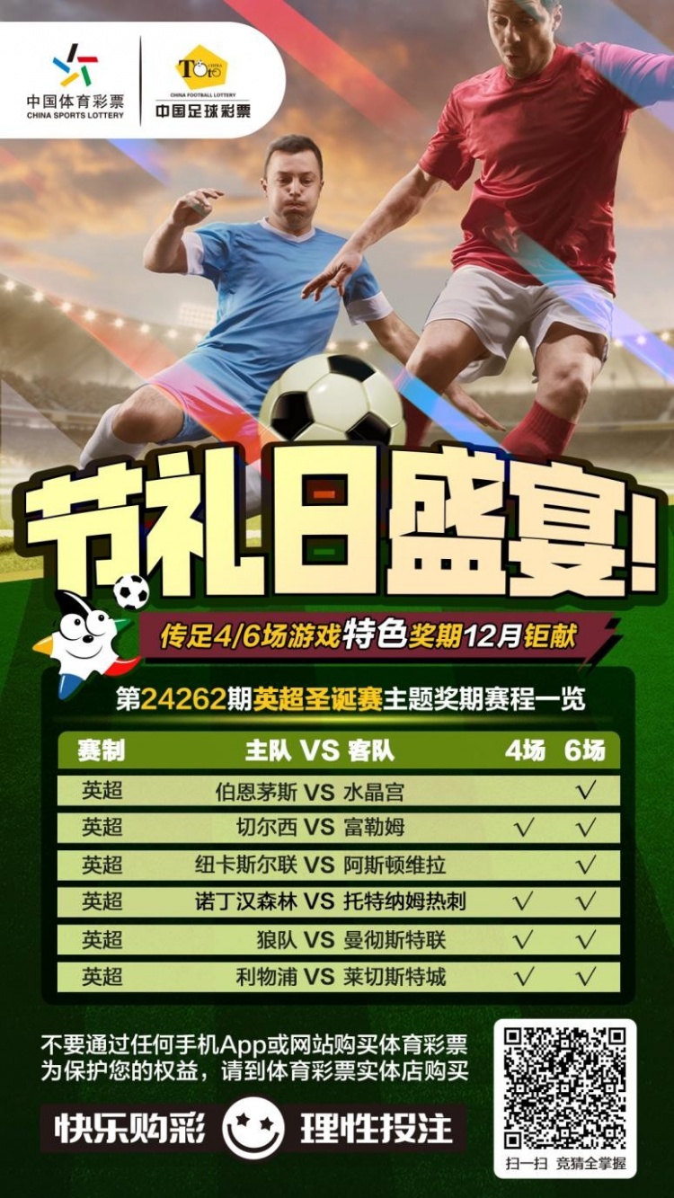 圣诞来临,英超不歇!传足4/6场游戏特色奖期第24262期竞猜场次聚焦英超圣诞节礼日赛事,具体场次:伯恩茅斯VS水晶宫、切尔西VS富勒姆、纽卡斯尔联VS阿斯顿维拉、诺丁汉森林VS托特纳姆热刺、狼队VS曼彻斯特联、利物浦VS莱切斯特城。