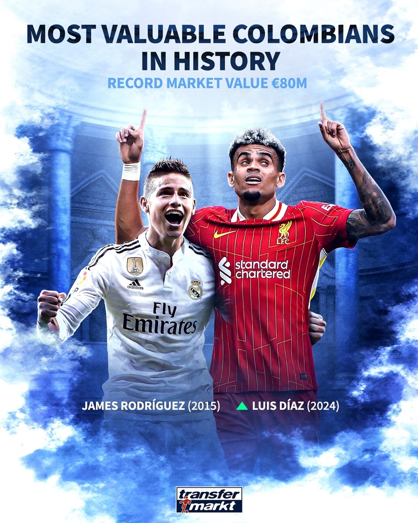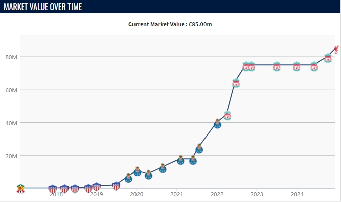 迪亚斯明年1月将满28岁,他在2022年冬窗加盟利物浦,转会费5200万欧,当时身价4000万欧。加盟红军不到一年,迪亚斯的身价迅速涨到7500万欧。但之后的两年时间里,迪亚斯身价“冰封”,两年不涨不跌。直到本赛季,迪亚斯身价经历两连涨来到8500万欧,成为利物浦队内身价最高的球员,同时一举打破J罗创造的哥伦比亚球员历史最高身价纪录(8000万欧)。