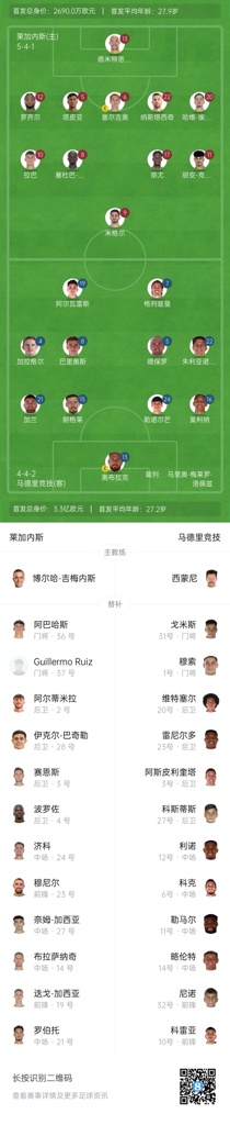 莱加内斯替补:36-阿巴哈斯、37-鲁伊斯、2-阿德里亚-阿尔蒂米拉、3-豪尔赫-萨恩斯、4-波罗佐、14-布拉萨纳茨、19-迭戈-加西亚、21-罗伯特-洛佩斯、23-穆尼尔、24-朱利安-济科、27-奈姆-加西亚、28-伊克尔-巴奇勒