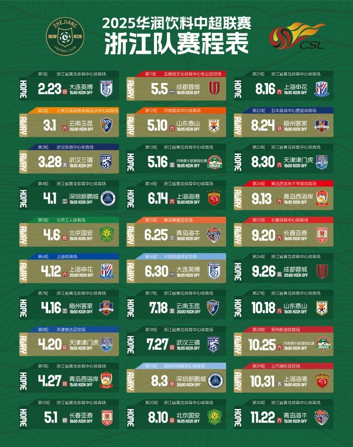 浙江队新赛季赛程:首轮对阵大连英博,4月连续客战国安申花