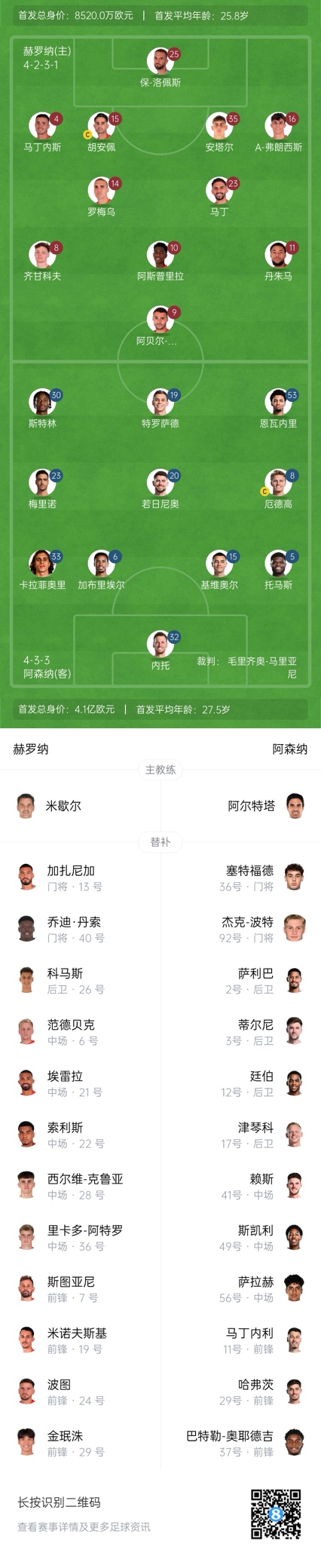 赫罗纳首发:25-保-洛佩斯、4-阿尔瑙-马丁内斯、35-雅各比什维利、15-胡安佩、16-亚历杭德罗-弗朗西斯、14-罗梅乌、23-伊万-马丁、8-齐甘科夫、10-阿斯普里拉、11-丹朱马、9-阿贝尔-鲁伊斯