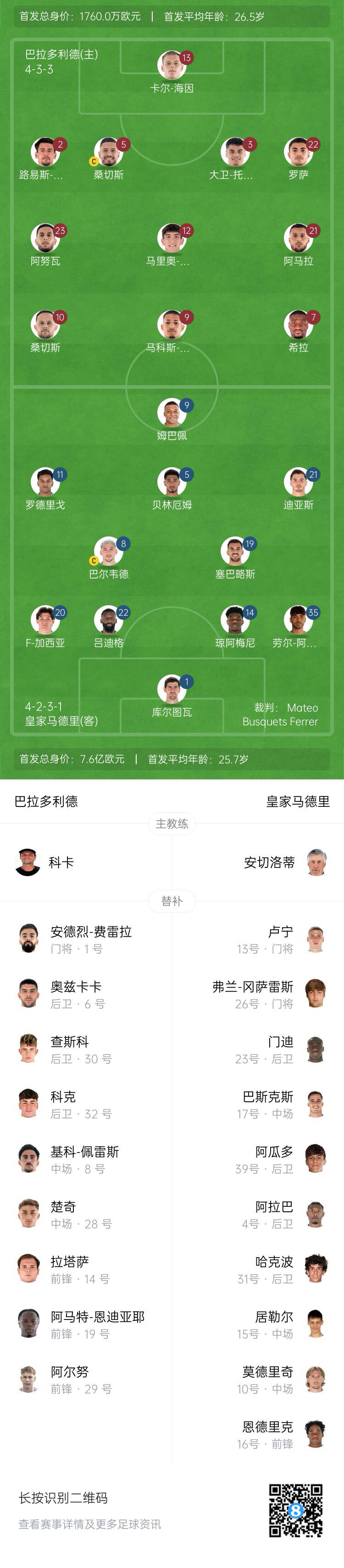皇马首发:1-库尔图瓦、35-劳尔-阿森西奥、14-琼阿梅尼、22-吕迪格、20-弗兰-加西亚、19-塞巴略斯、8-巴尔韦德、21-迪亚斯、5-贝林厄姆、11-罗德里戈、9-姆巴佩