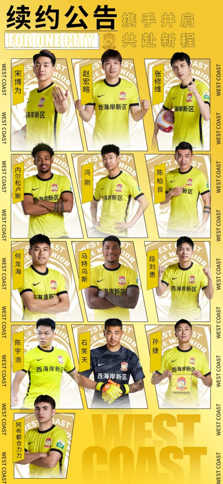 西海岸官方:与内尔松卢斯、马特乌斯、张修维等13名球员续约