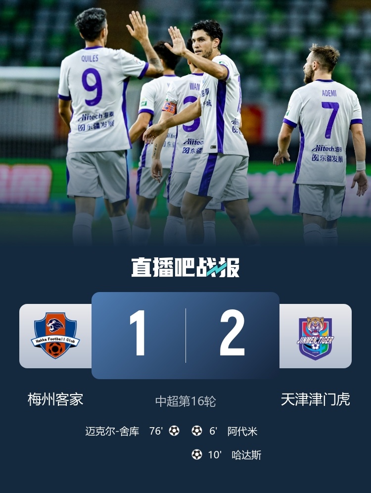 津门虎2-1客胜梅州客家送对手联赛7连败 阿代米传射哈达斯破门