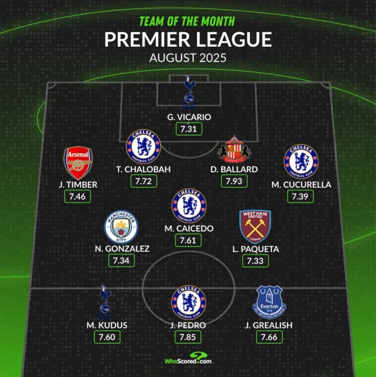 whoscored英超8月最佳阵:若昂-佩德罗领衔切尔西4将,红军0人