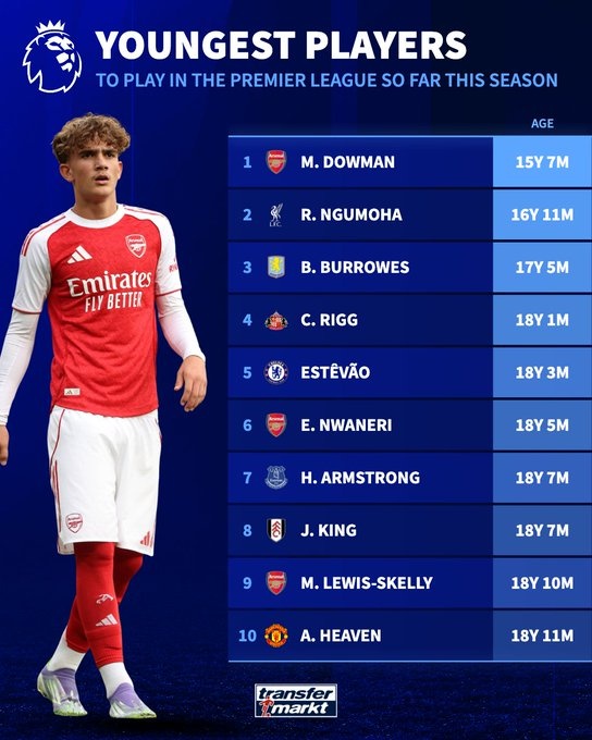 9月13日讯 德转列本赛季英超截止目前出场最年轻球员排行,道曼15岁7个月最年轻,恩古莫哈第二。