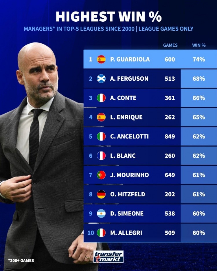 本世纪教练五大联赛胜率榜:瓜帅74%居首,弗格森、孔蒂二三位