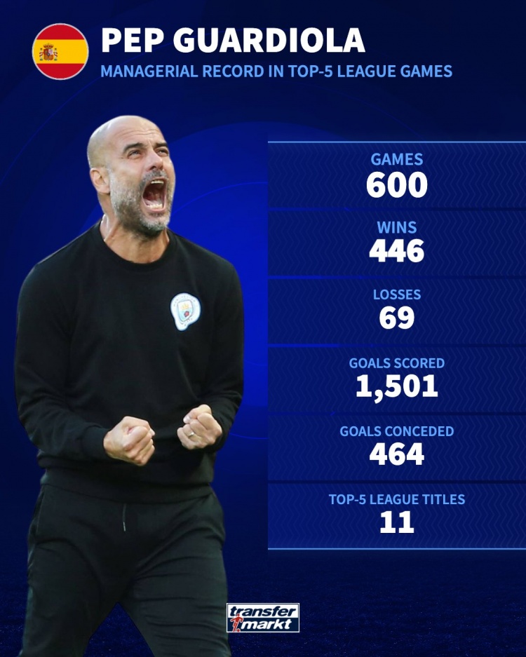 9月15日讯 德国转会市场统计了本世纪五大联赛教练的联赛胜率,并列出榜单,瓜迪奥拉执教600场,取胜446场,胜率74%居首。