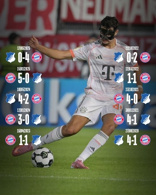 拜仁晒海报盘点对霍芬海姆战绩:6胜2平2负,近两次交锋进9球